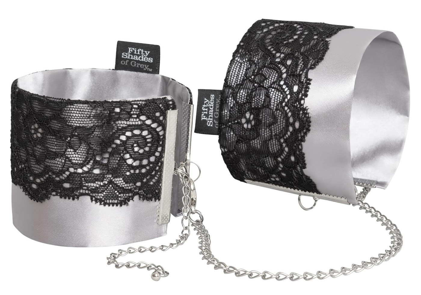 Pár smyslných saténových pout stříbrné barvy s jemnými ozdobami z černé krajky.