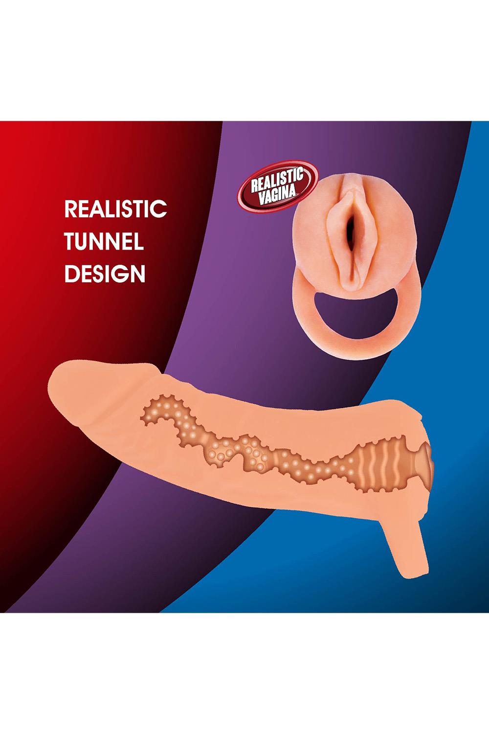 Praktická 2v1 pomůcka pro páry i sólo: z jedné strany funguje jako hollow návlek na penis (prodloužení), který přidá na objemu i délce a zároveň může pomoci s delší výdrží díky mírnému snížení citlivosti. Otočením získáte realistický masturbátor s vagínou – uvnitř je těsný, strukturovaný tunel pro intenzivnější stimulaci.