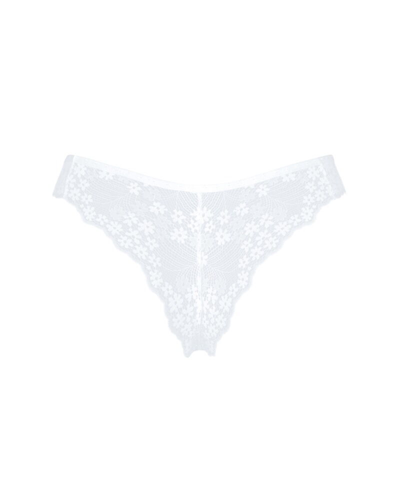Bílá tanga Heavenlly od Obsessive vyrobená z jemného strečového tylu. Svůdně prezentovaná bílá s krásnou květinovou krajkou. V brazilském střihu do V s malým šperkovým prvkem v přední části pasu.