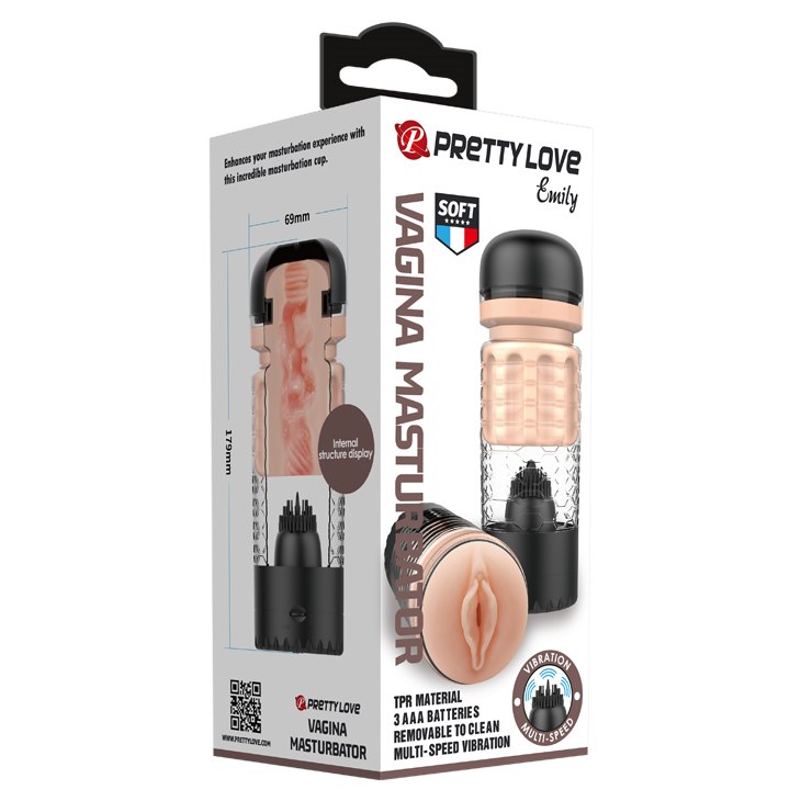 Pretty Love Emily je realisticky zpracovaný masturbátor pro muže, který kombinuje texturovanou vnitřní vložku s vibračním stimulačním jazýčkem. Vložka je měkká a elastická, takže se příjemně přizpůsobí a poskytuje „objímající“ pocit po celou dobu stimulace. Po zapnutí se aktivuje spodní část a jazýček začne „líbat“ a masírovat, čímž podpoří silnější a hlubší orgasmus.