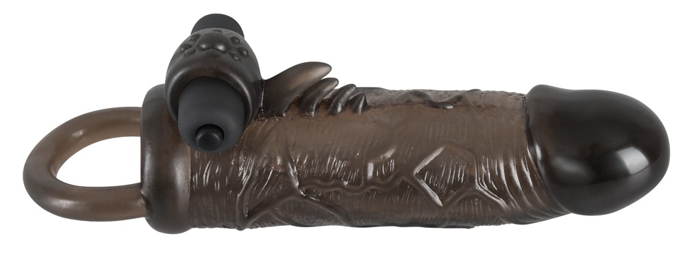 Flexibilní, kouřově zbarvené, průhledné pouzdro na penis s malými stimulačními jazýčky, žilkovaným povrchem, tvarovaným žaludem a kulovitým otvorem držáku vibrátoru, ze kterého lze pevný vibrátor potažený sametem vyjmout a použít samostatně (například na předehru).