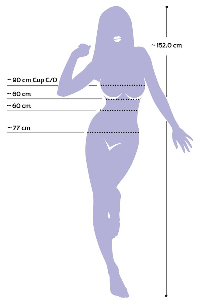 Obvody: prsa 90 cm, pas 60 cm, boky 77 cm