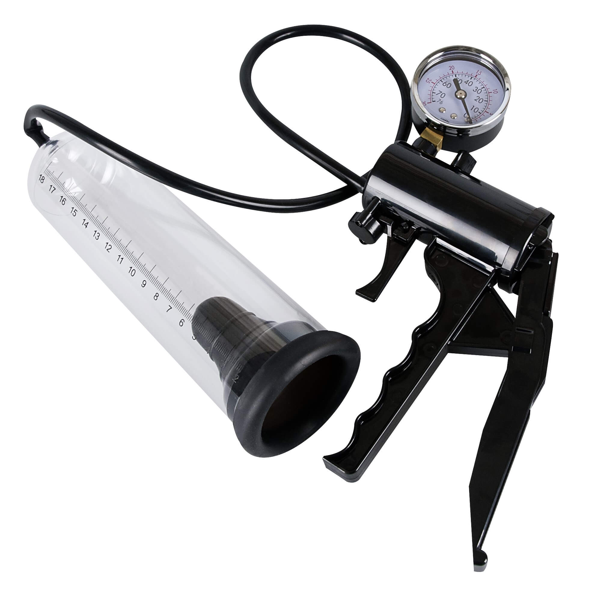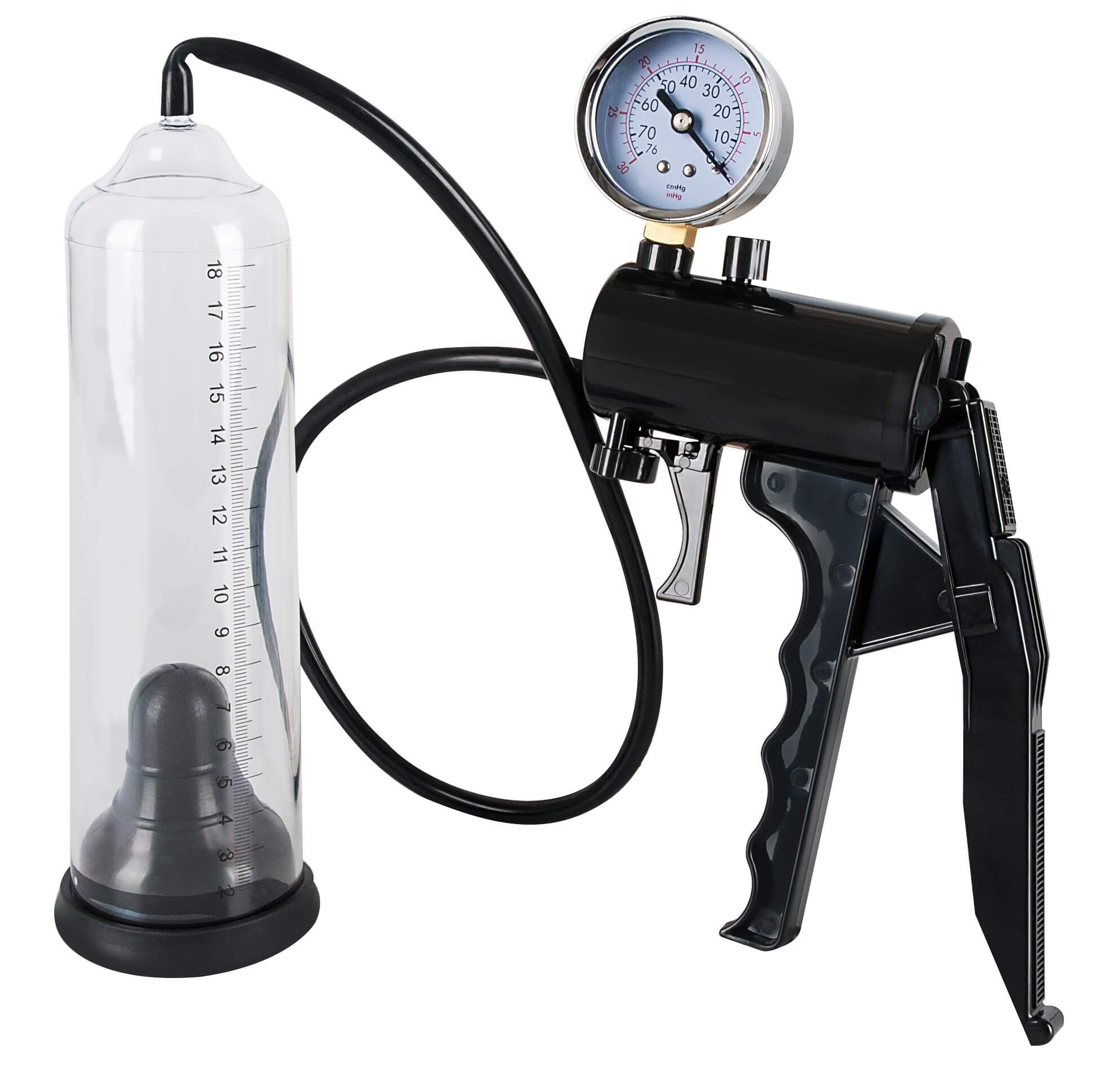 Pumpa má ukazatel tlaku a měřící stupnici (až do délky 21 cm) délky Vašeho penisu.
