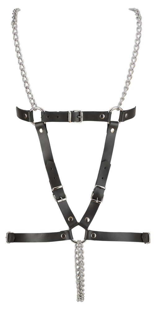 Kvalitní body z řemínků z pravé kůže, otevřené na ohanbí, s řetízkovým designem, kovovými řetízkovými ramínky a ozdobnými kovovými kroužky, jakož i divokými cvočkovými ozdobami.